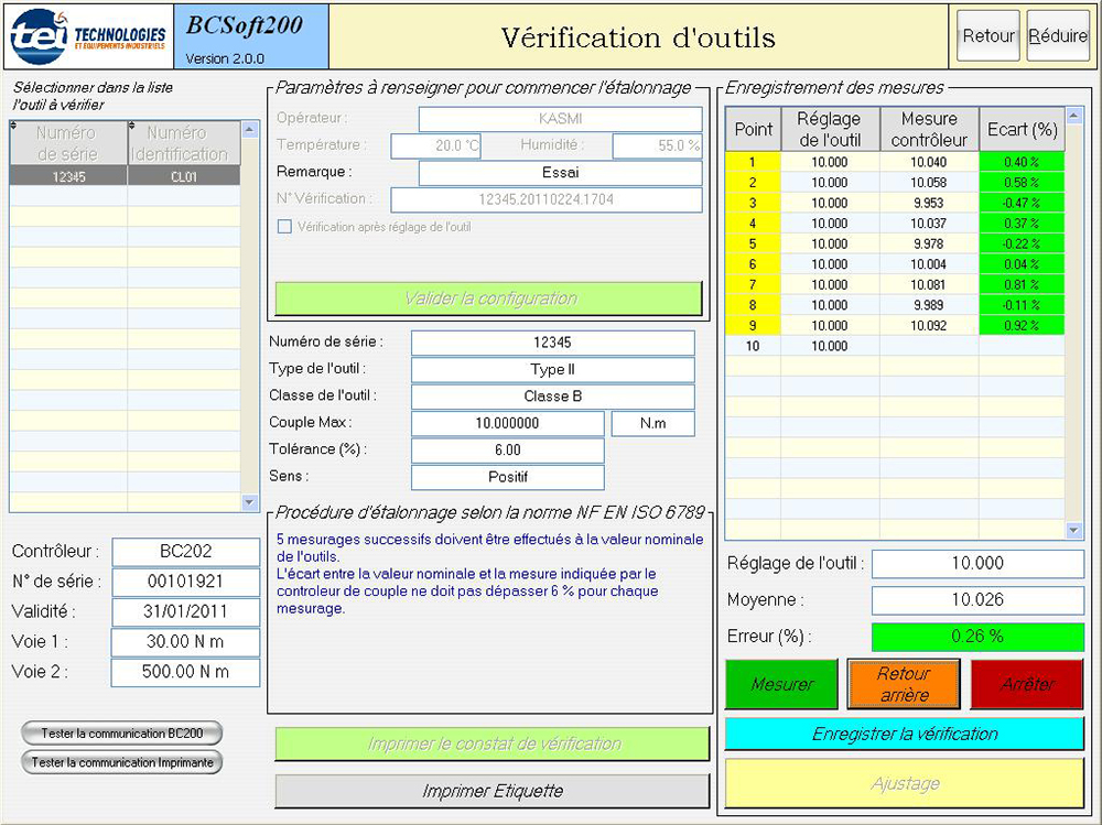 Ce logiciel est conçu pour être utilisé avec le contrôleur de couple BC310. Il permet de faire l'acquisition des mesures lors de l'étalonnage d'une clef dynamométrique sur le banc et d'éditer un procès verbal. Il vous permet de sauvegarder les mesures et constitue un outil de qualité pour la gestion de votre parc de clef dynamométriques.