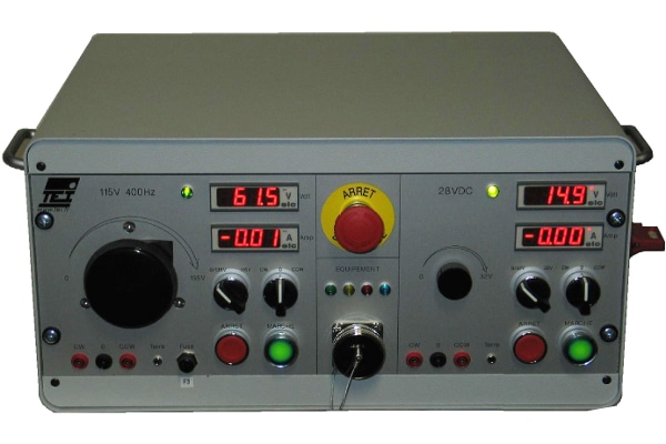 Ce coffret permet d’alimenter un grand nombre d'équipements aéronautiques dans le cadre d'essais au sol. Il delivre des tensions avioniques 28Vdc et 115V - 400Hz. La valeur de ces tensions est ajustable. Des voyants présents en face avant du coffret permettent le contrôle des switchs d'équipements avions.