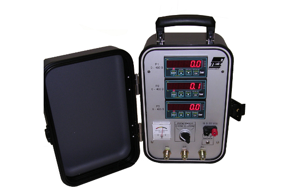 Cette valise portable intègre : - Une batterie avec chargeur et indicateur de l’état de charge - 3 capteurs de pression - 3 conditionneurs afficheurs - 3 entrées de pression sur raccords rapides